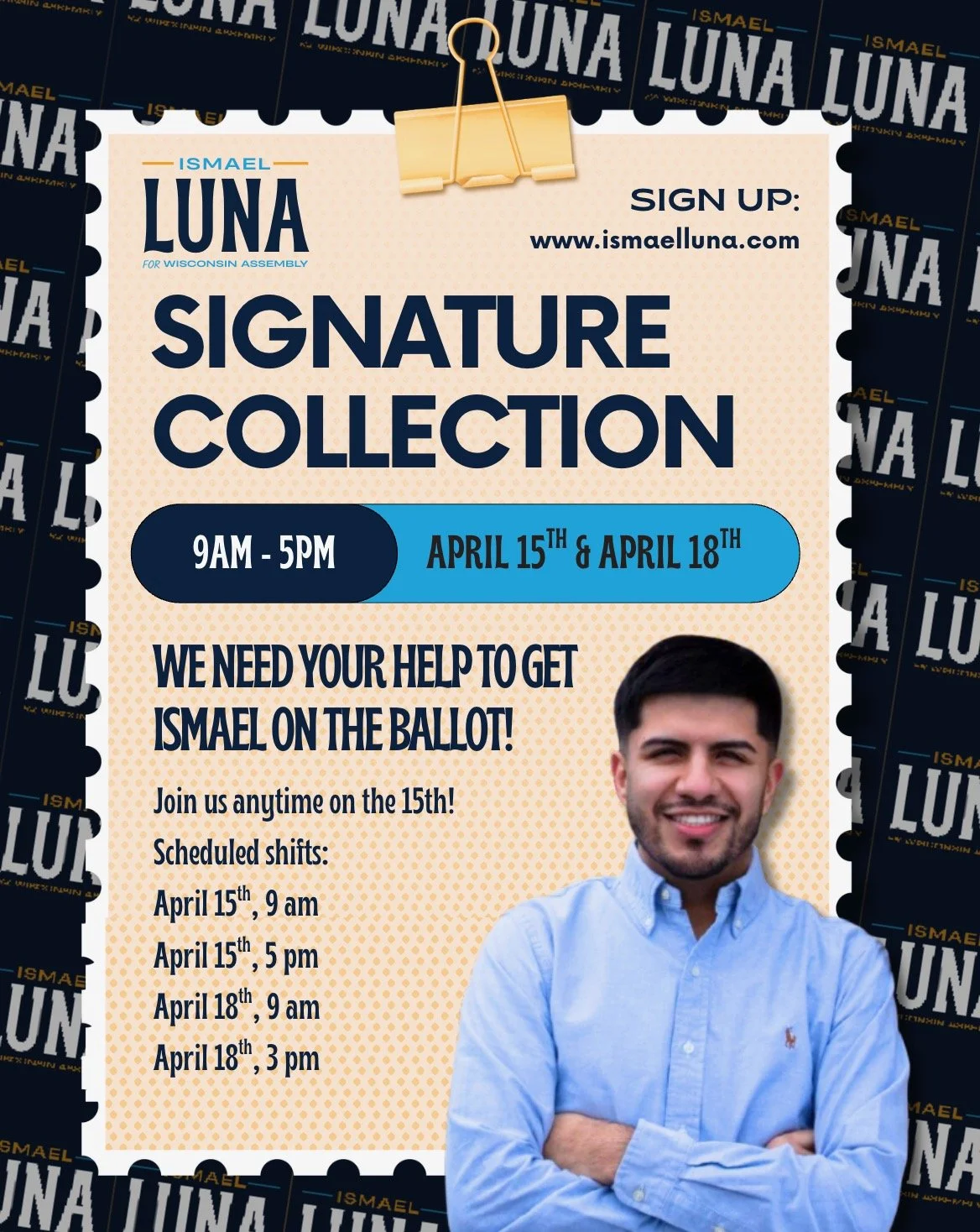 Join us anytime on April 15th to collect signatures in the neighborhood! Fill out the form and let us know when you are available. We will have set shifts on April 15th at 9am and 5pm - but also on April 18th at 9am and 3pm. Help us get Ismael on the ballot!